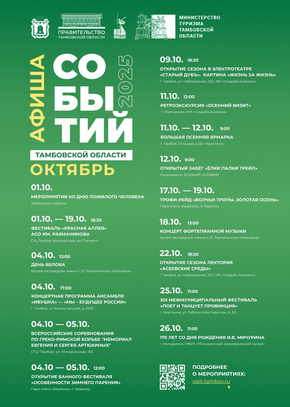 26 октября | 11:00 | «170 лет со дня рождения И.В. Мичурина» Мероприятие посвящено великому ученому И.В. Мичурину. | МБУК «Мичуринский краеведческий музей» г. Мичуринск, ул. Советская, 297Г | Вход свободный |